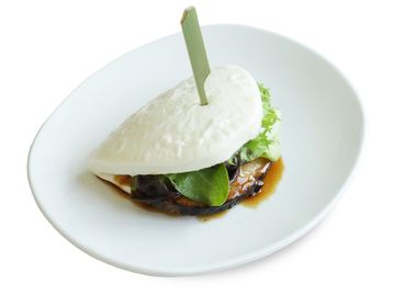 Sliced roasted pork belly with spring mix on a steamed bun