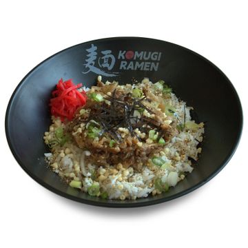 Shredded chashu pork, ramen egg, tempura crisps, seaweed flake, green onion and rice seasoning (Contain sesame seeds) over steamed rice with Japanese mayo and Teriyaki sauce