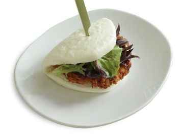 Crispy breaded deep fried pork cutlet with spring mix on a steamed bun